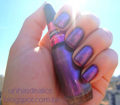Primeiro passei o DUPLO SENTIDO - Impala! Esse é da nova coleção Rebelde (é a segunda com esse nome) e foi lançada na semana passada! O esmalte é duocolor: lilás com reflexo cinza! LINDO mas muito RALO e precisei passar 3 camadas (e 4 em algumas unhas)! O esmalte é realmente muito maravilhoso mas o acabamento não ficou tão bom pelo tanto de camada que precisei passar...deu até umas bolinhas que amenizei com extra brilho!